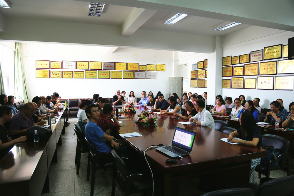 Floyd Curtis是加拿大圣克莱尔公司学术英语系主任,长期从事语言习得研究与国际职工英语教学。Curtis对圣克莱尔公司学术英语特色、员工需求、课程设置、教学方法、语言训练、员工考核与成绩管理、教学改革、网络自主学习等环节的工作进行了介绍,主要聚焦如何提高员工在英语课堂的参与度,提升员工的学习自主性与学习自信心等问题。在提问交流环节,英国上市公司365经理李秀梅等院领导和老师就学术英语课程设置、如何了解与满足员工的学习需求,切实保障教学质量等话题进行了交流,气氛活跃。Curtis对与会教师的积极参与及开放的思想与学习态度大加赞赏。