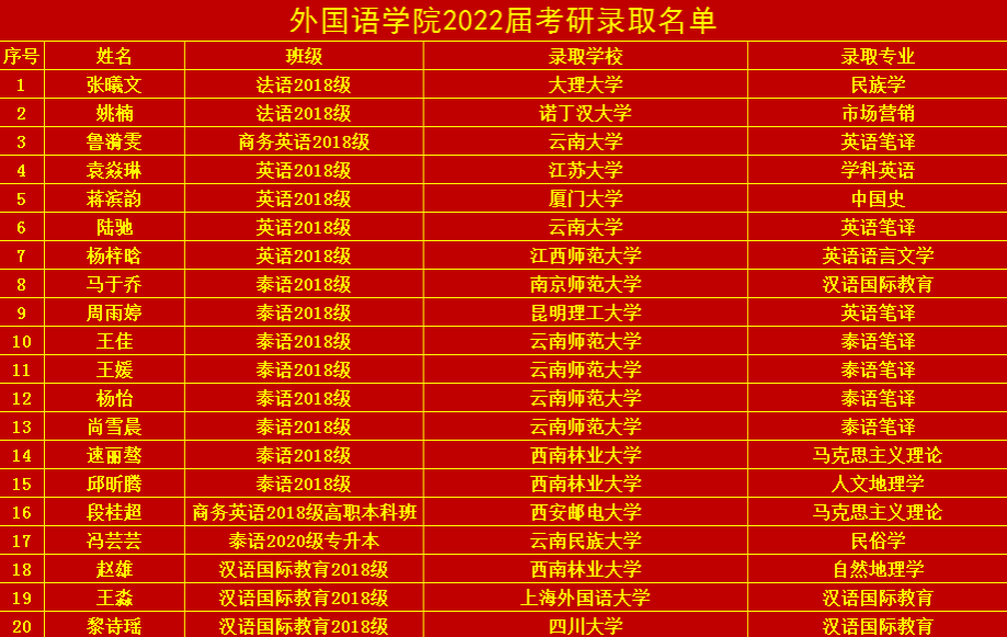 2022届共计有253名本科员工,在今年的研究生考试中,已有20名同学确定录取,还有多名同学正在申请攻读国外高校研究生,预计2022届研究生录取比例不低于10%,其中泰语专业研究生录取比例目前已达26.5%,法语、英语和汉语国际教育专业研究生录取比例目前均已超过10%,员工考研再创佳绩。